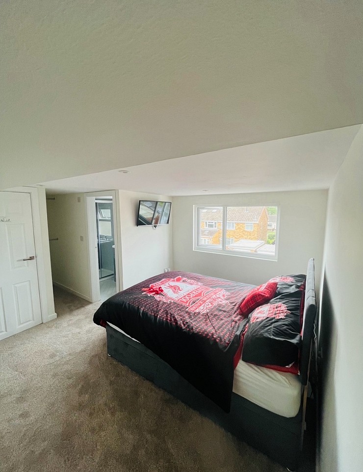 This extensive dormer loft conversion, measuring over 9 metres in width, is situated in Sutton Park, Hull. We expertly optimized the available space to deliver a highly functional and sophisticated living area, incorporating eaves storage with integrated lighting, a walk-in wardrobe, a contemporary ensuite, and a generous double bedroom.